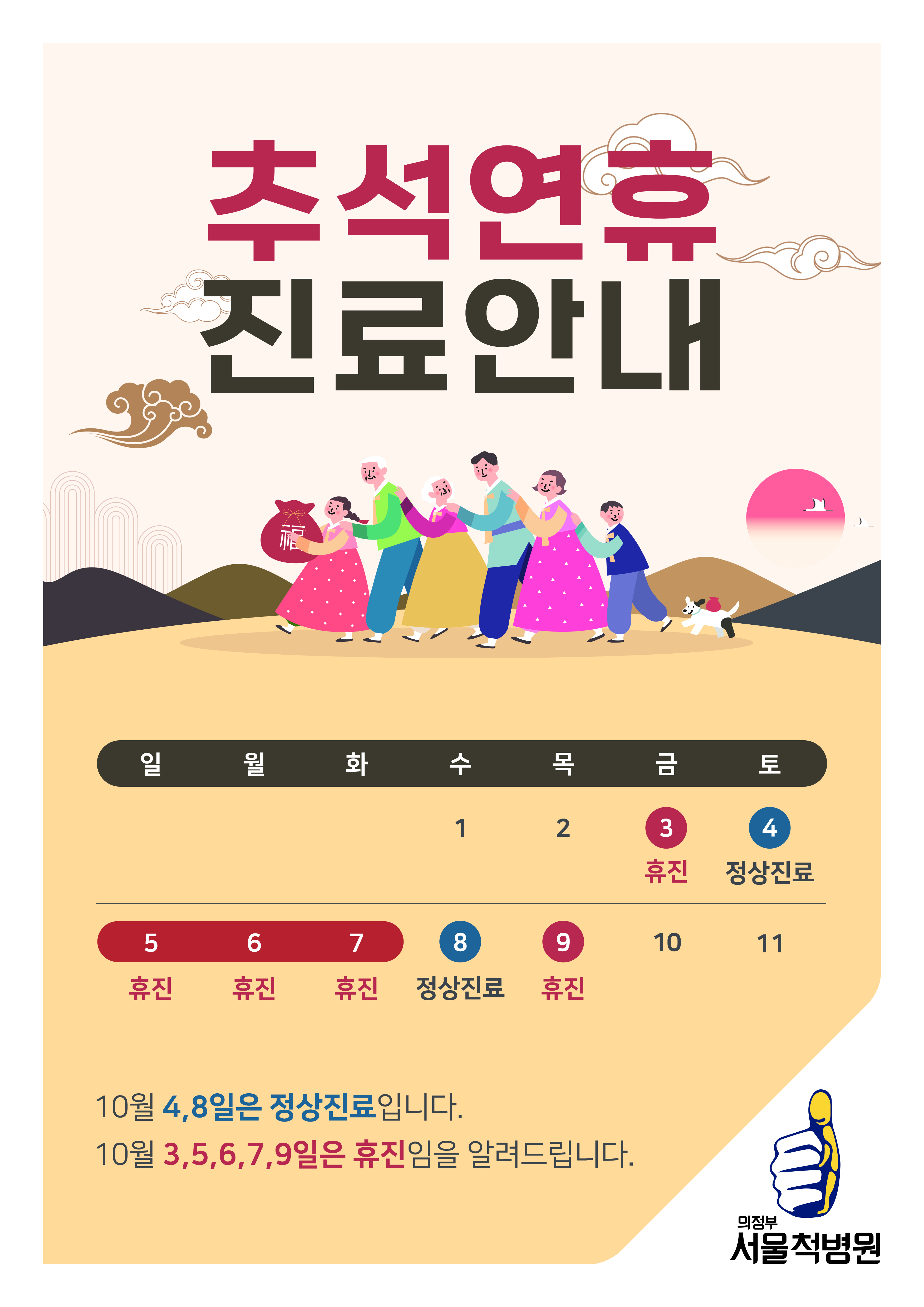 ![]() 안녕하세요~ 의정부 서울척병원입니다. 민족의 명절 추석을 맞이하여 그동안 잘 만나지 못했던 가족들을 뵙고 기쁨의 시간을 보내시기를 기대하고 소망합니다. 그럼 모두들 풍요로운 한가위 보내세요. 의정부 서울척병원 추석연휴 진료일정을 안내해드립니다. 휴진 10월 3일(금), 10월 5일(일), 10월 6일(월), 10월 7일(화), 10월 9일(목) 정상진료 10월 4일(토), 10월 8일(수) 추석 연휴 진료 일정 확인하시어 진료에 착오 없으시길 바라겠습니다. |