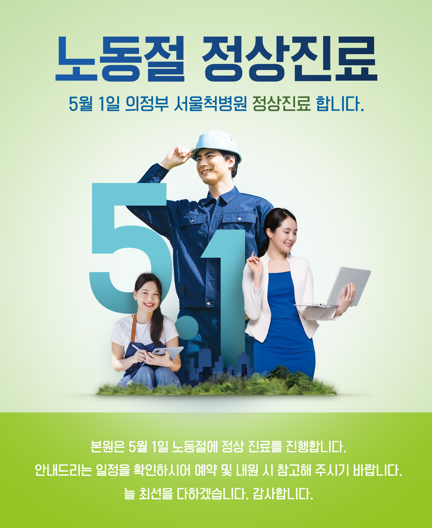 이제,수혈적정성평가도 1등급! 이전 평가는 2등급이었지만, 변화와 개선을 통해 2차는 1등급을 달성했습니다. 고객이 안심하고 선택할 수 있도록 끝까지 노력하겠습니다. 바로가기 전문 치료사의1:1 맞춤 재활 치료도수운동재활센터! 임상 경험이 풍부한 전문치료사가체계적인 재활 치료를 통해 빠른 일상 복귀를 도와드립니다. 바로가기 의정부서울척병원전 병동간호·간병 통합서비스 지정 환자와 가족의 소중한 일상과 재정은 물론,불안하고 지친 마음까지 지켜드리겠습니다. 바로가기 공지사항 5월 1일 노동절 정상진료 안내 2026.04.06